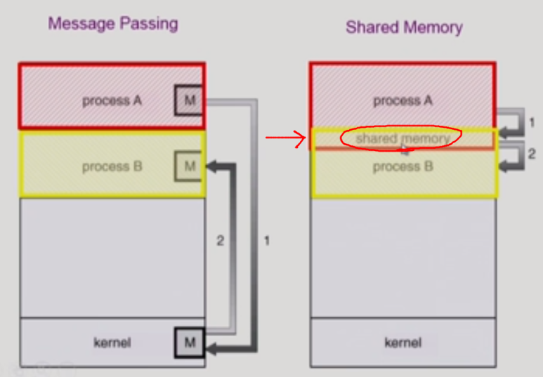 • shared memory : 서로 다른 프로세스 간에도 일부 주소 공간을 공유하게 하는 shared memory 매커니즘이 있음 (원칙적으로는 프로세스는 독자적인 주소공간은 갖음)