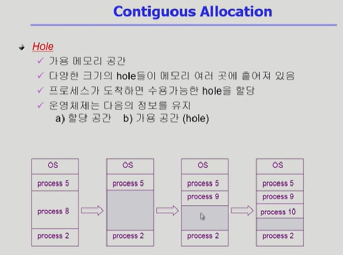 가변 분할 방식에서 프로세스가 생성과 소멸과정을 거치면서 메모리 내 빈 공간이 생기는데 이를 hole이라고 합니다.