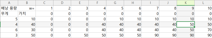 표를 통해 각 셀은 wkg 배낭에 채울 수 있는 최대 가치를 의미하는 것을 알 수 있다.