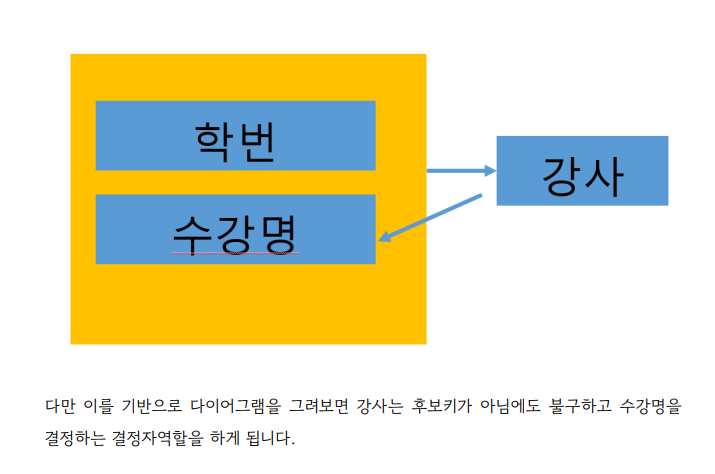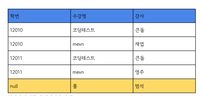 - 삽입 이상 : 새로운 강사가 특정 과목을 담당한다는 새로운 정보를 추가할 수 없다. 적어도 한 명 이상의 수강 학번이 필요하다.