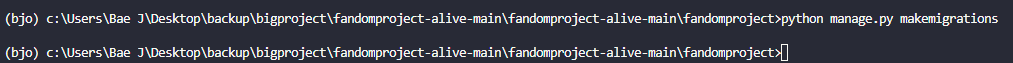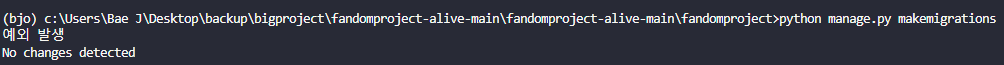 예외가 발생하긴 합니다. No changes detected 라고 마이그레이션이 안됬다고 떠서 바로 마이그레이션 해줍니다.