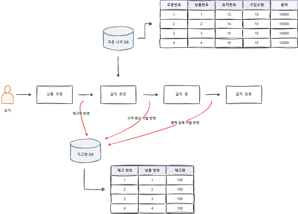 유저가 주문서비스의 주문 API를 호출하면 먼저 유저의 정보와 상품 번호 구입 수량 정보가 주문 내역 DB에 저장됩니다. 이후 결제 서비스에 진입하여 주문 내역 DB 정보를 바탕으로 재고량 계산, 결제 금액 계산을 하는데요. 결제 API를 호출한 유저번호에 해당하는 주문 내역 DB row를 조회하여 실제 재고량 계산에 필요한 상품번호, 구입수량 DTO로 변환하는 과정을 거치게 됩니다. 그 다음 상품번호와 일치하는 재고량 DB를 조회하여 재고량을 계산해주는 플로우로 재고 관리가 이뤄지게 됩니다. (결제 금액 또한 동일한 플로우로 진행되니 관련 내용은 생략하겠습니다.)