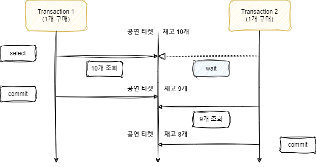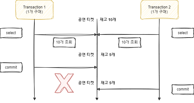 트랜잭션 1에서는 현재 공연 티켓 재고인 10개에 1개 구매에 대한 재고를 차감해 9개로 갱신을 할 것이고, 트랜잭션 2에서는 트랜잭션 1에서 요청이 있었는 알 수있는 방법이 없으므로 처음에 조회한 10개에 다시 1개를 차감하여 9개라는 엉뚱한 값으로 재고를 갱신 할 것입니다.