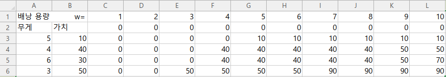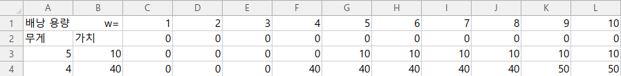 표를 통해 각 셀은 wkg 배낭에 채울 수 있는 최대 가치를 의미하는 것을 알 수 있다.
